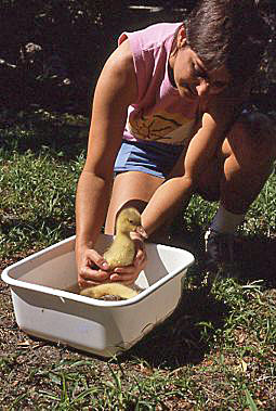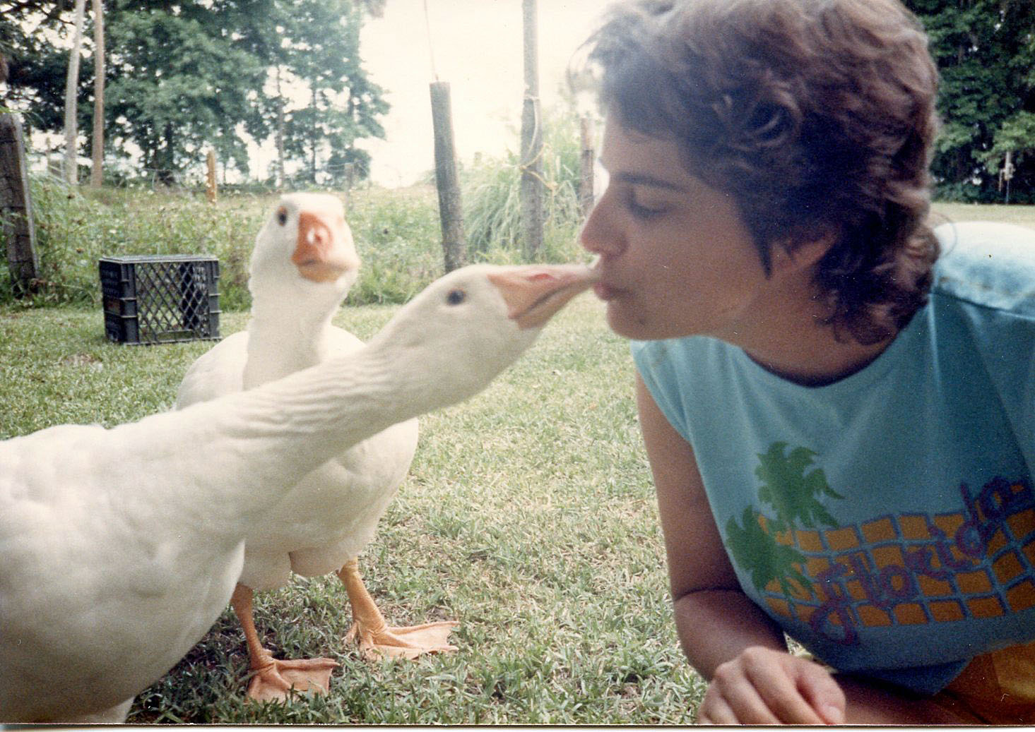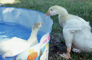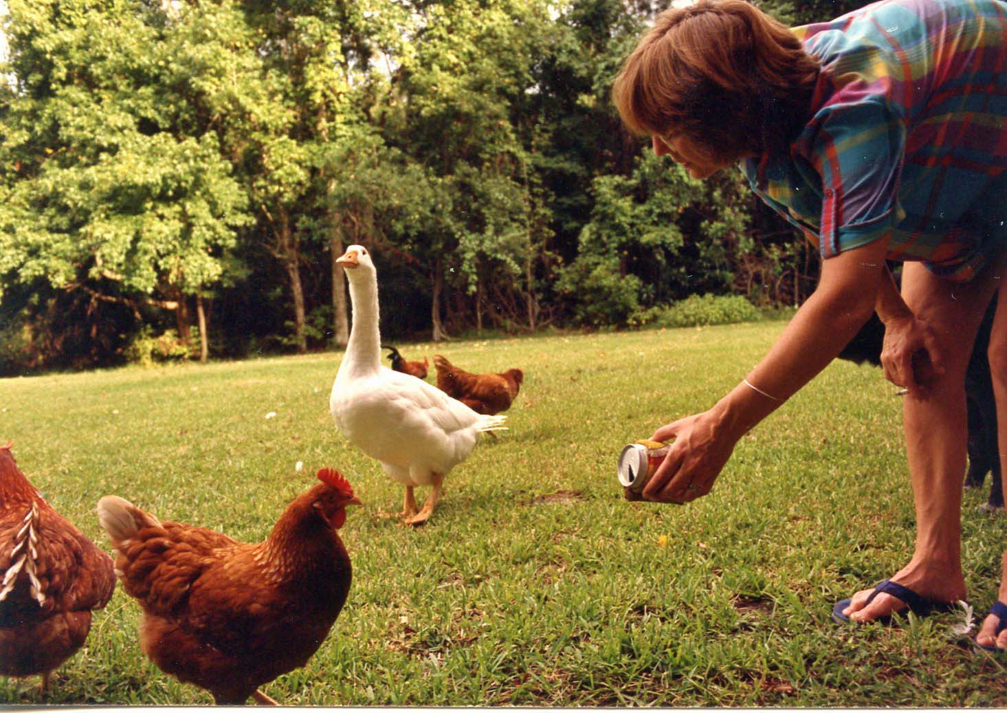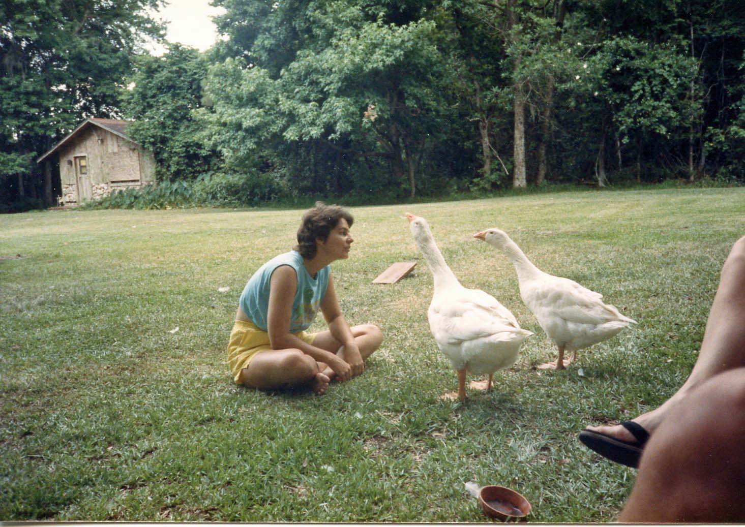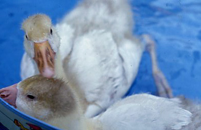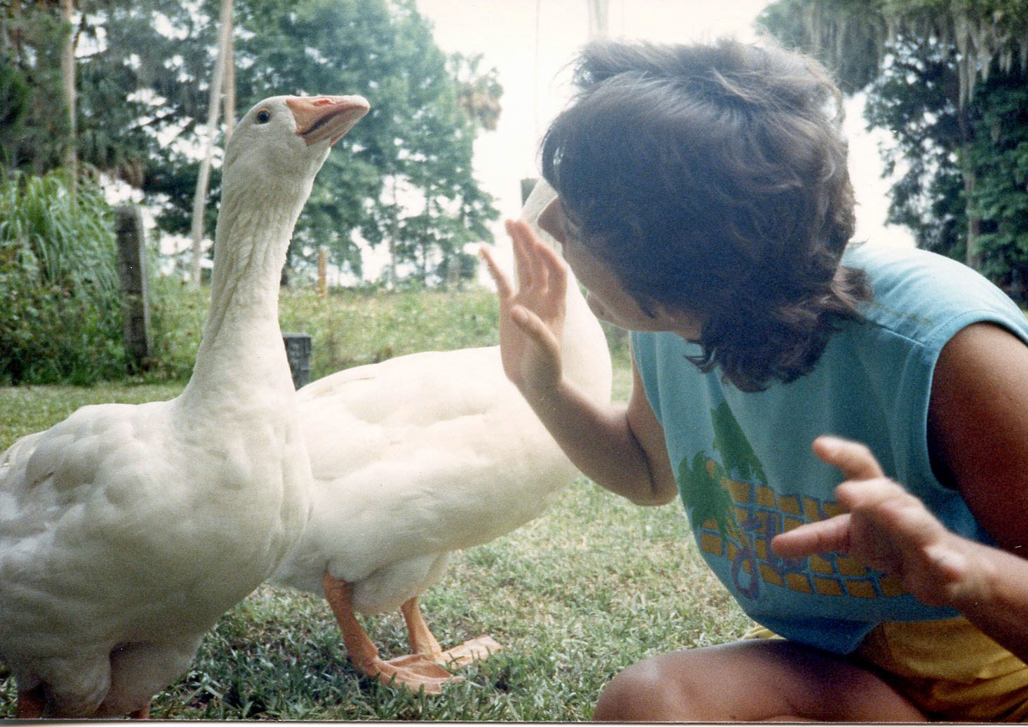 Concerned that the geese might make their way into the lake, where large gators roamed at will, we set up a kiddie swimming pool, much to the birds’ delight. We’d spy out the windows and laugh at their antics as they frolicked in the pool, splashing in with abandon, frantically swimming about squawking and flapping their wings vigorously, causing small molted feathers to fly every which way. With such wild activity, they soon learned to take turns, sliding in over the pool edge on their breasts, flapping and splashing about, then clambering out awkwardly, sometimes landing beak-first.