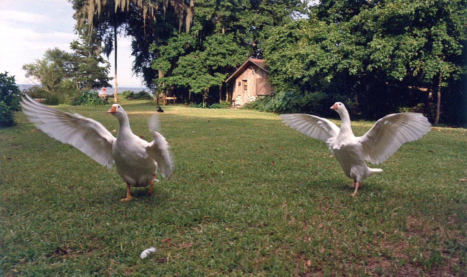 At some point, we noticed a couple of the hens were missing. We counted beaks and, sure enough, we were shy two adult hens. When we shared this disturbing news with friends who lived on a farm near Ocala, they recommended that we get a pair of geese.